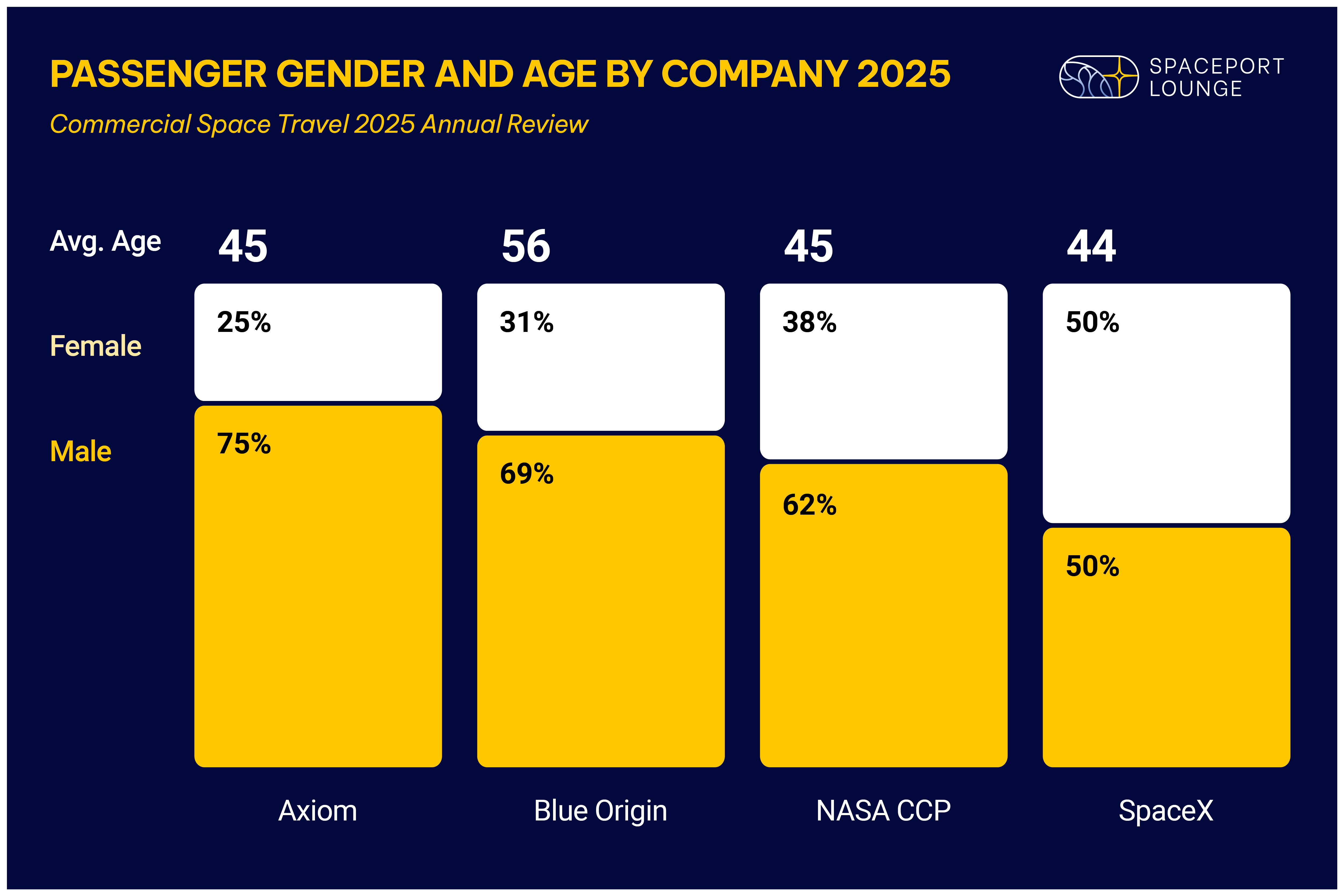 Passenger demographics varied meaningfully by operator and mission profile. SpaceX maintained an even gender split, consistent across missions where it controls crew selection in collaboration with its patrons.