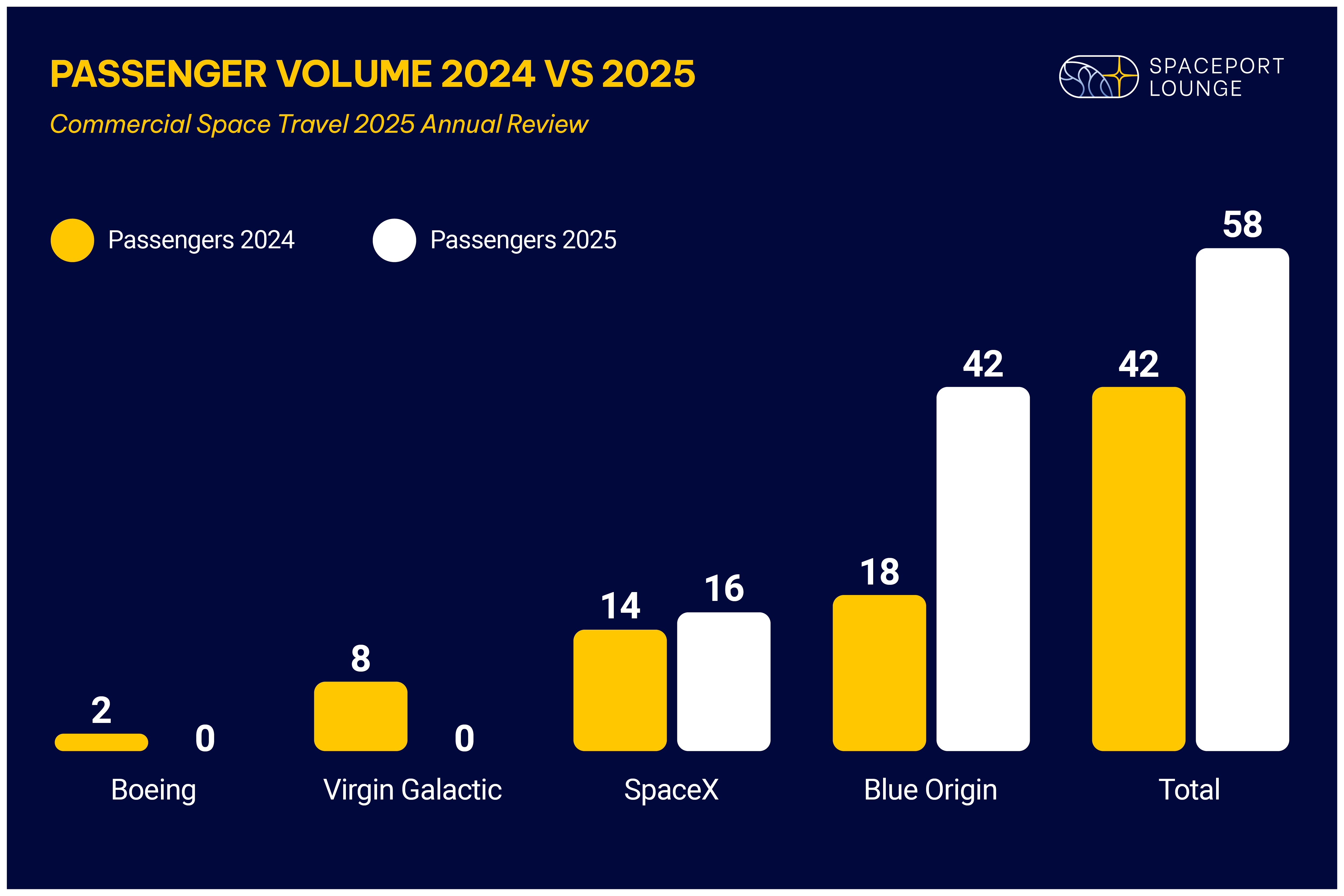 Total commercial space passenger volume increased from 42 in 2024 to 58 in 2025, a 38 percent gain. Blue Origin accounted for the majority of the increase, more than doubling its passenger count year over year as it approached a near-monthly launch cadence.
