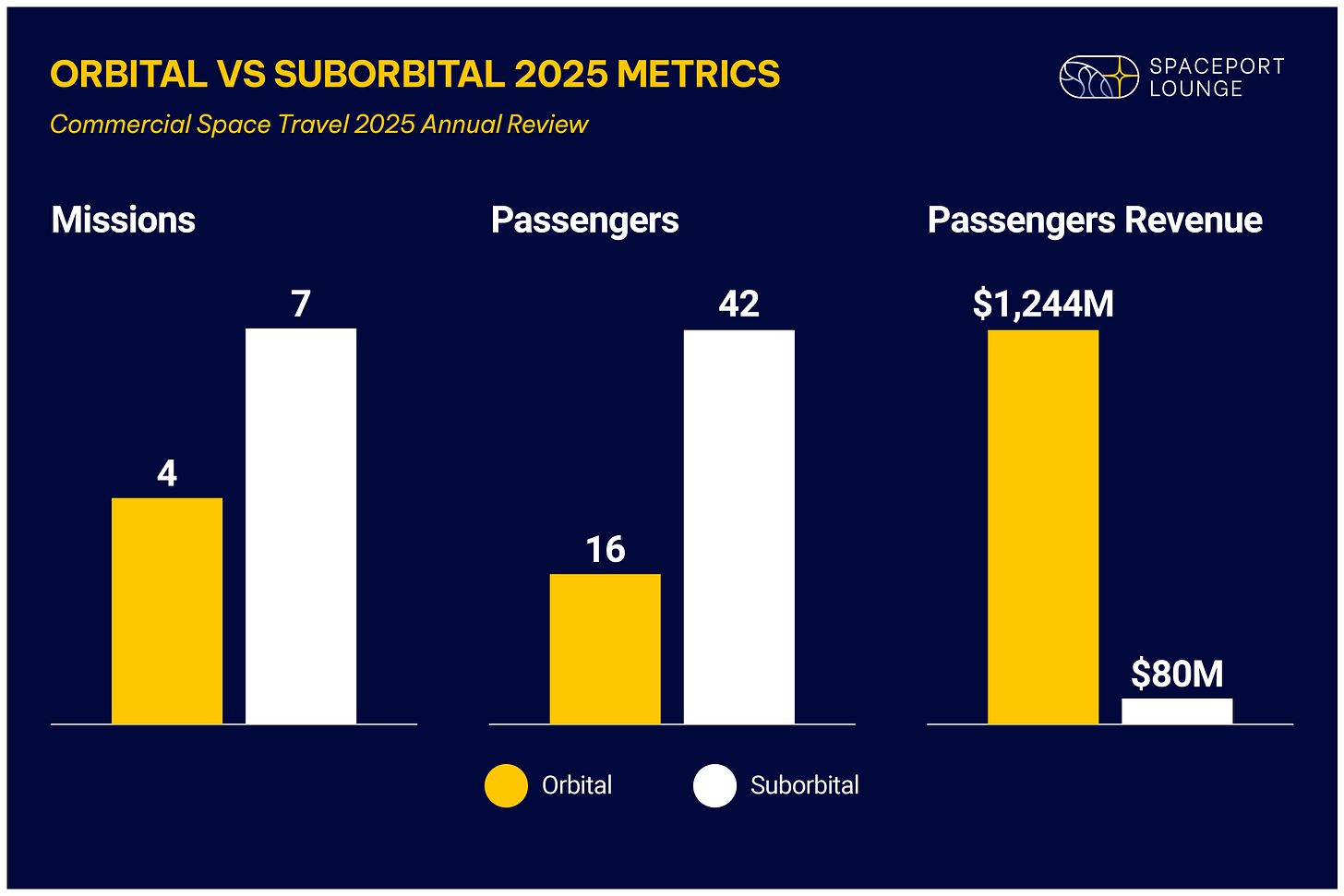 Suborbital missions outnumbered orbital flights nearly two to one in 2025 and carried more than twice as many passengers. Yet orbital missions generated over 90 percent of total passenger revenue. The contrast illustrates the structural divide within the market: suborbital travel scales people, while orbital travel scales revenue.