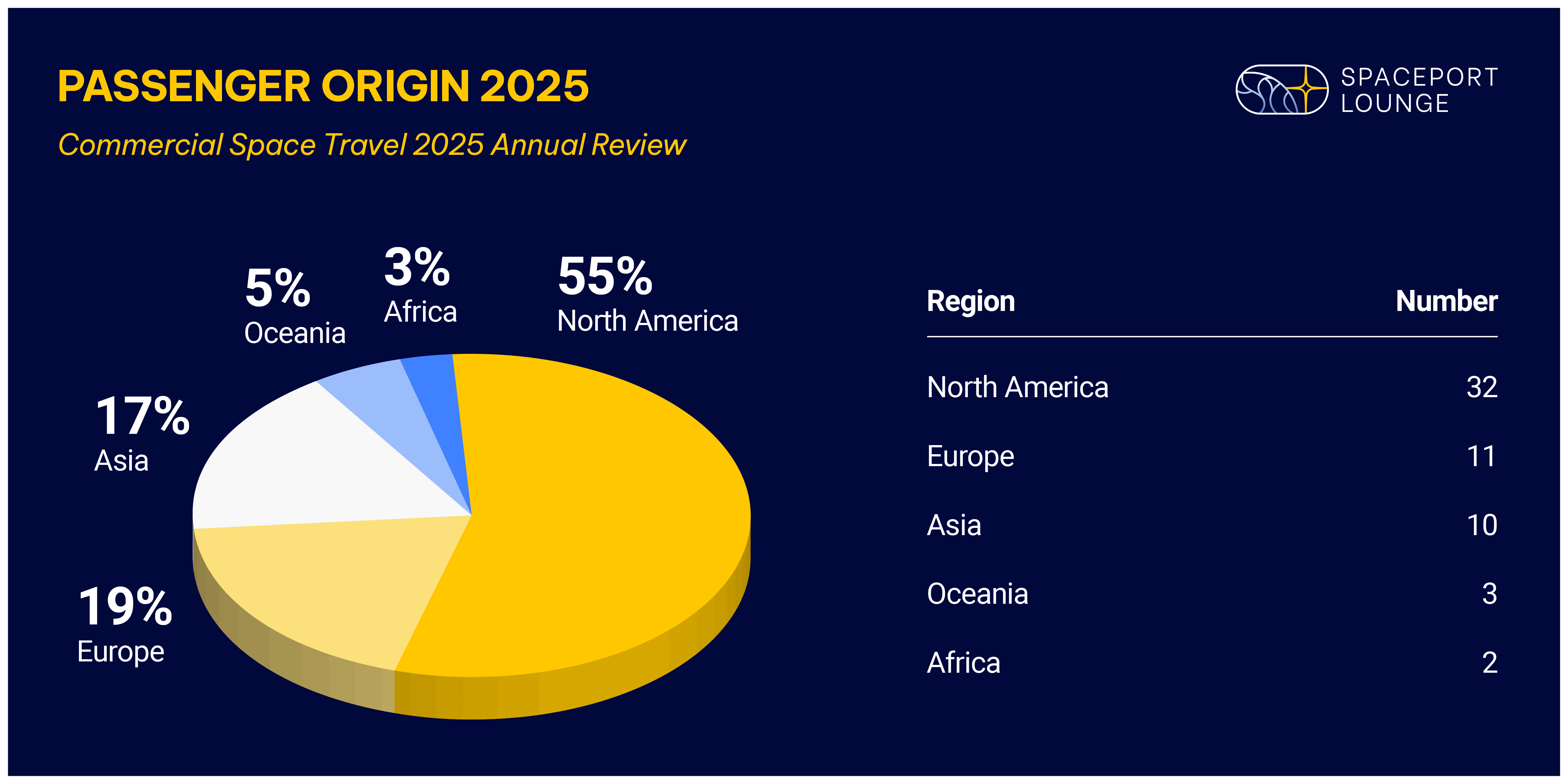 Geographic diversity expanded modestly in 2025 but remains uneven. North America accounted for 55 percent of all commercial space passengers, down from a midyear high of 69 percent, while maintaining a dominant position.