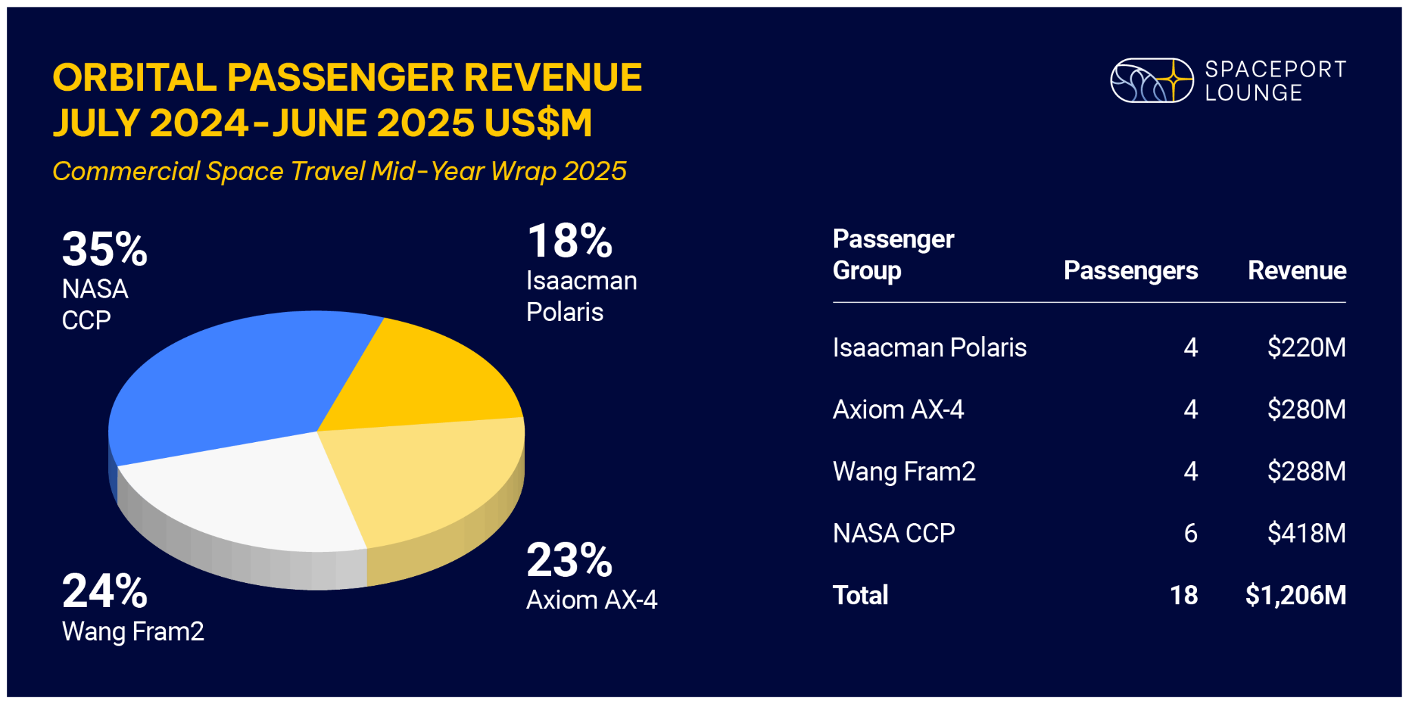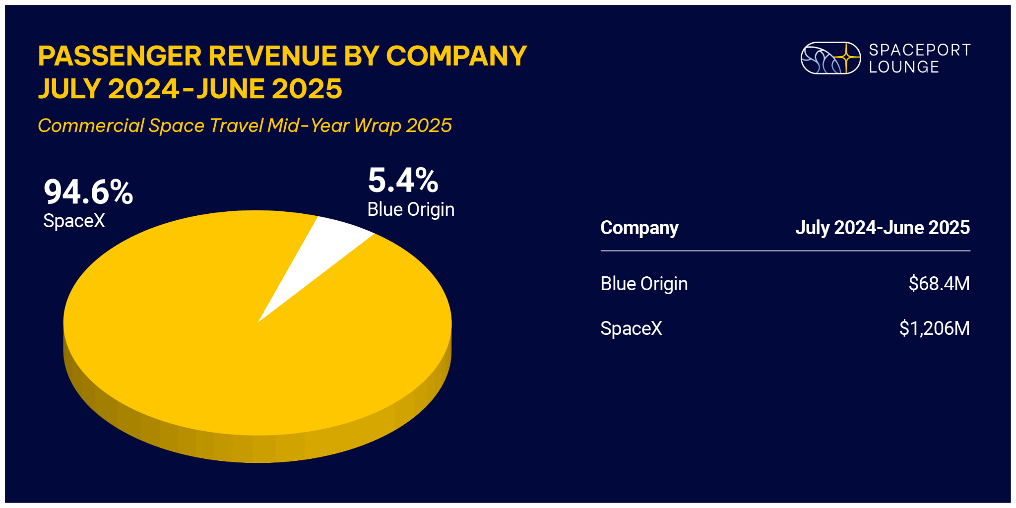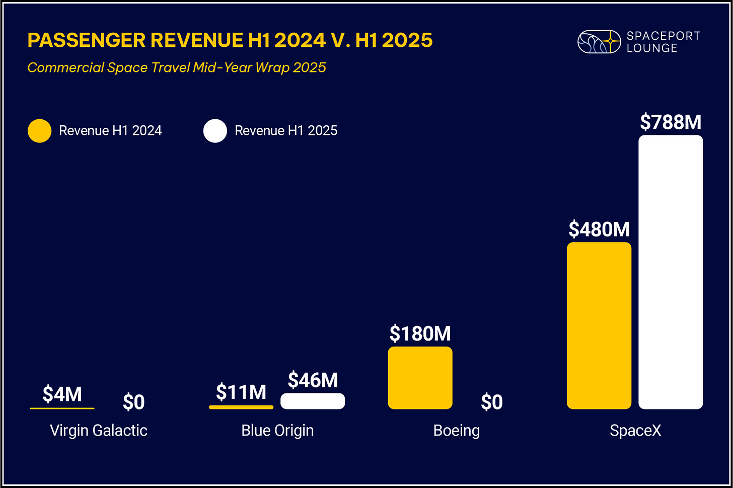 Passenger revenue in commercial space travel is surging year-over-year, but all of the gains are concentrated in just two companies. In the first half of 2025, SpaceX grew its already dominant orbital revenue base by $300 million, while Blue Origin quadrupled its suborbital passenger count after expanding its fleet. Together, they account for 100% of the sector’s commercial passenger revenue in the first half of 2025.