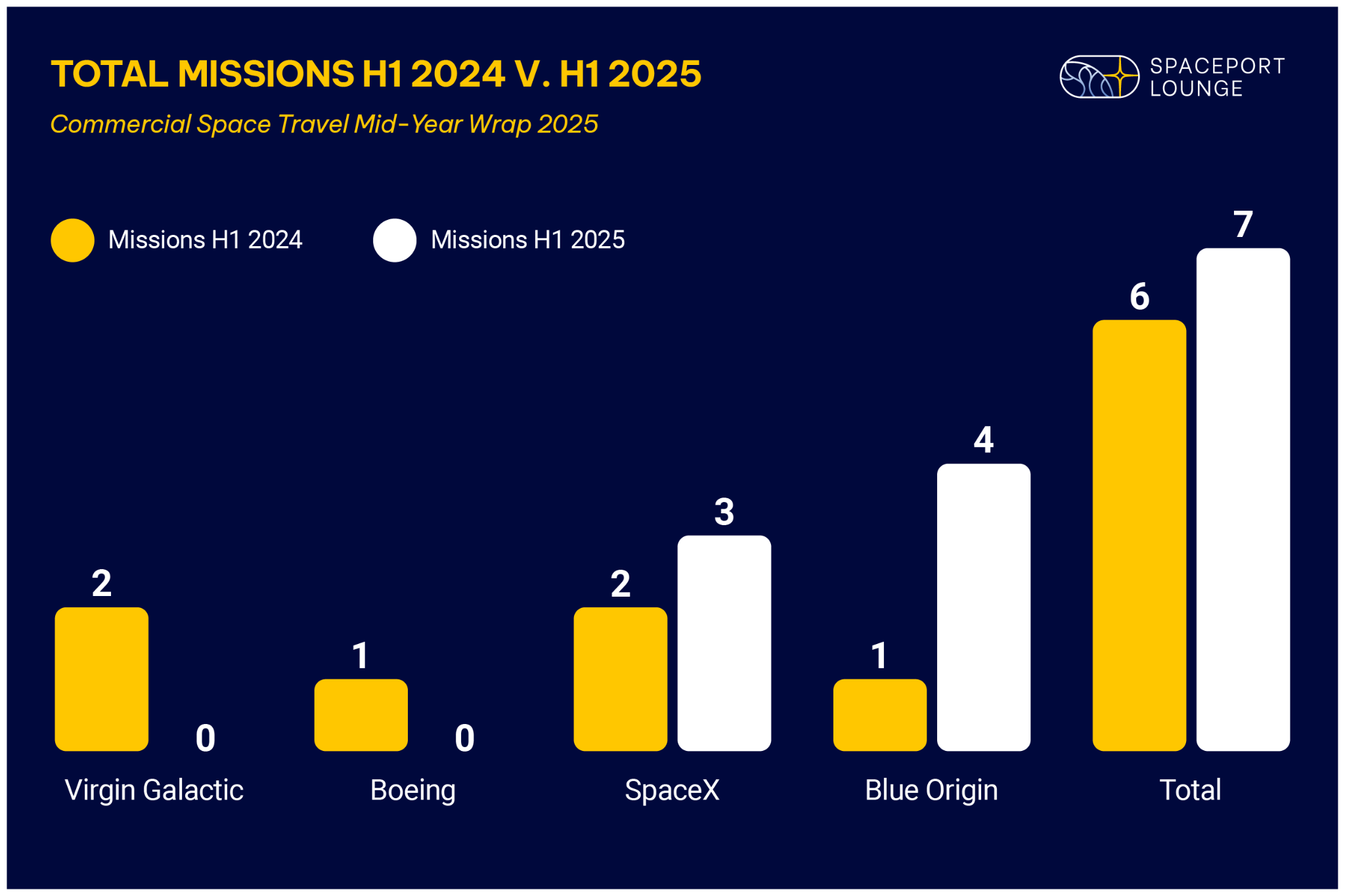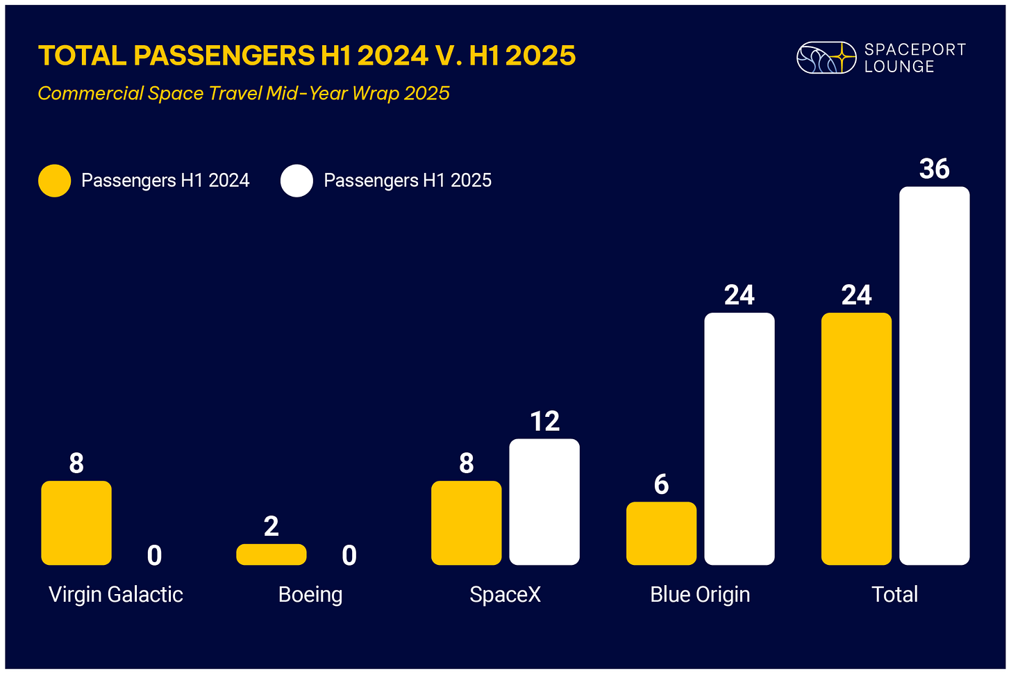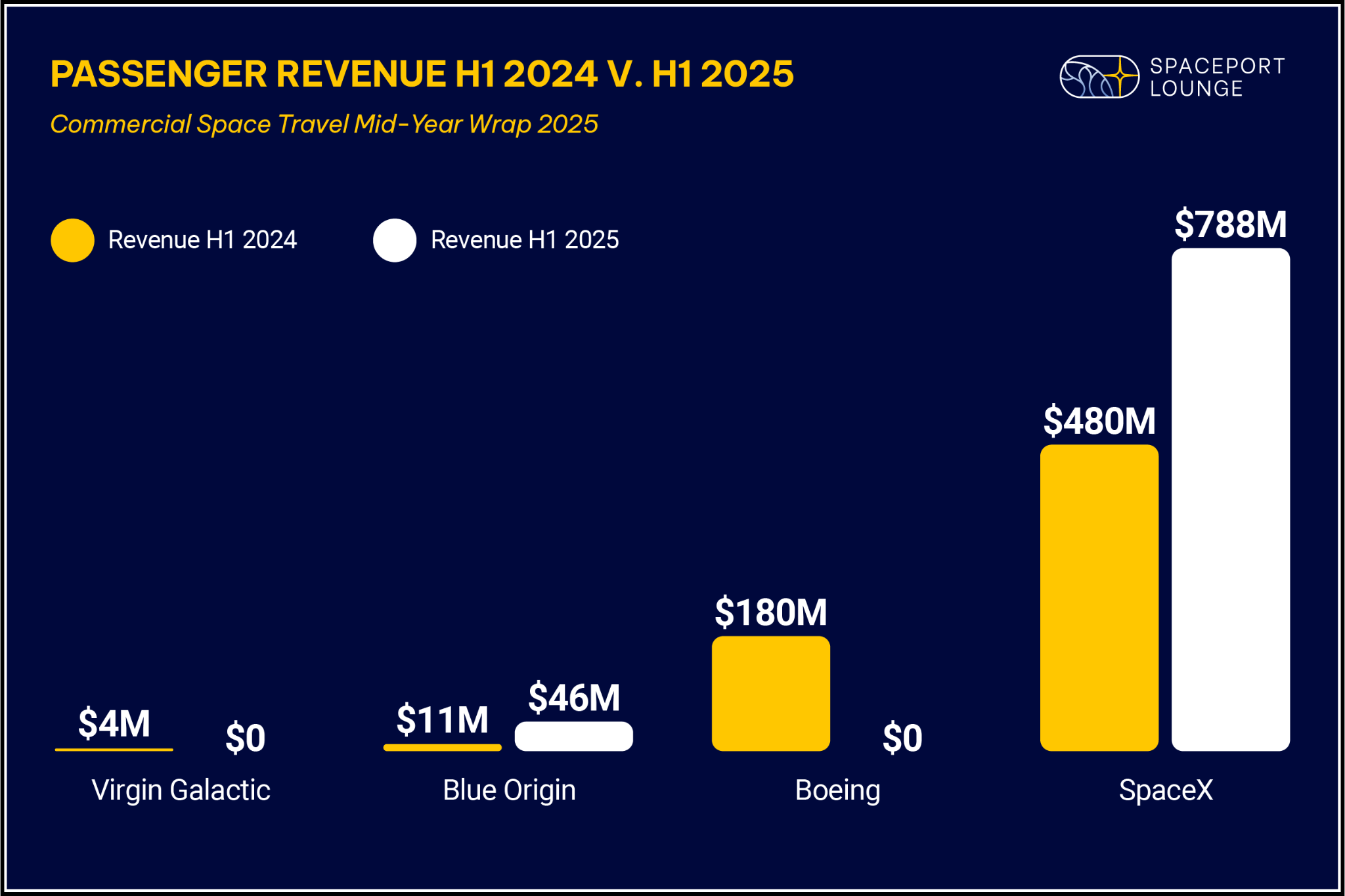 Industry growth came despite Boeing and Virgin Galactic recording no flights or passengers in the first half of 2025, widening the gap between active operators and those on pause.