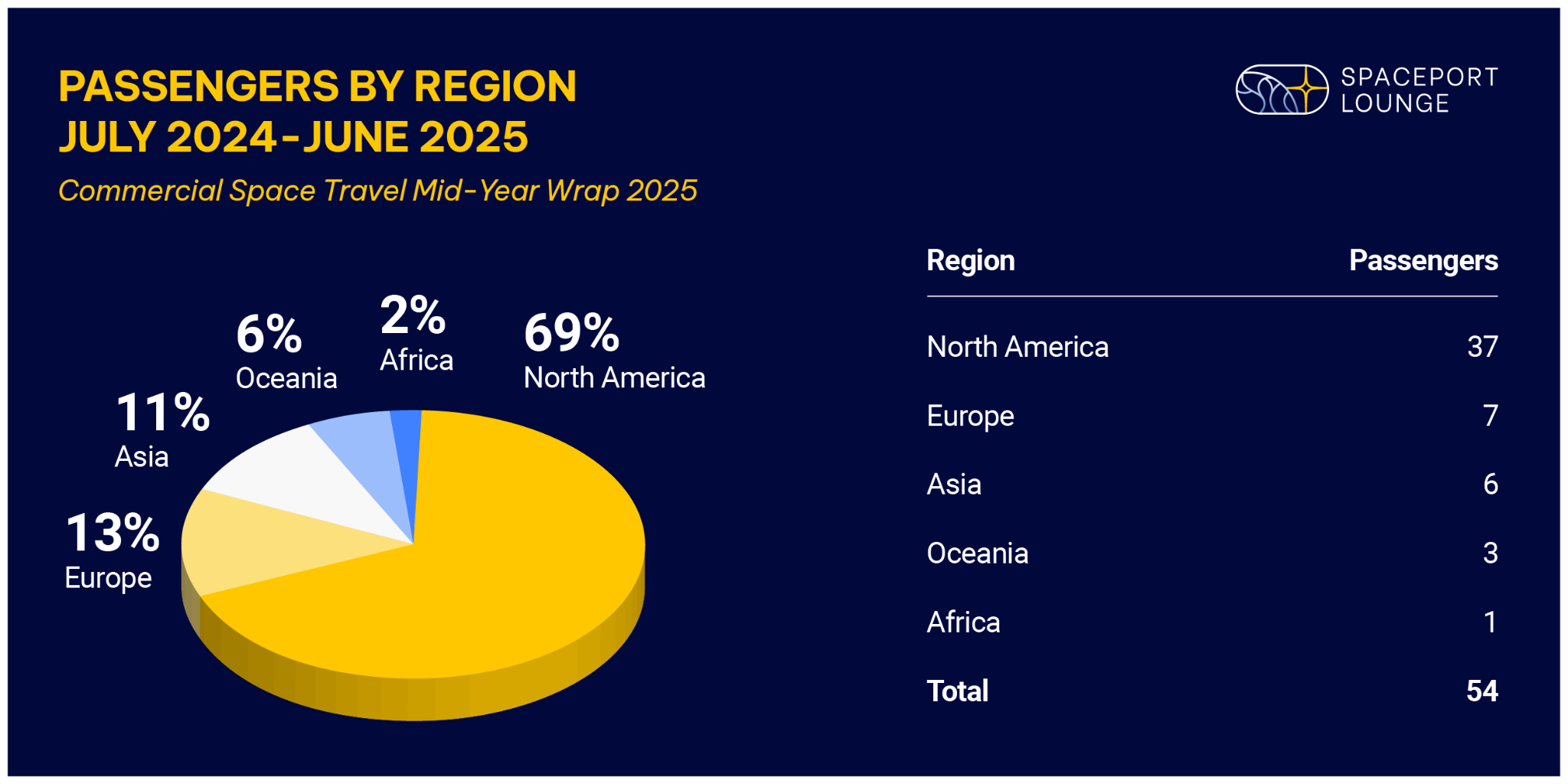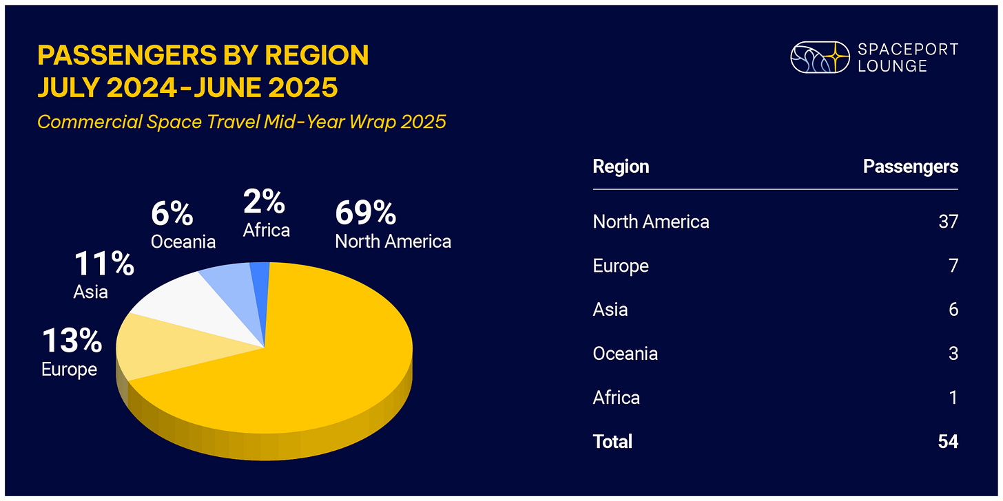 North America accounts for nearly 70% of all commercial space passengers. Learn how the rest of the world divides the remaining 30%.